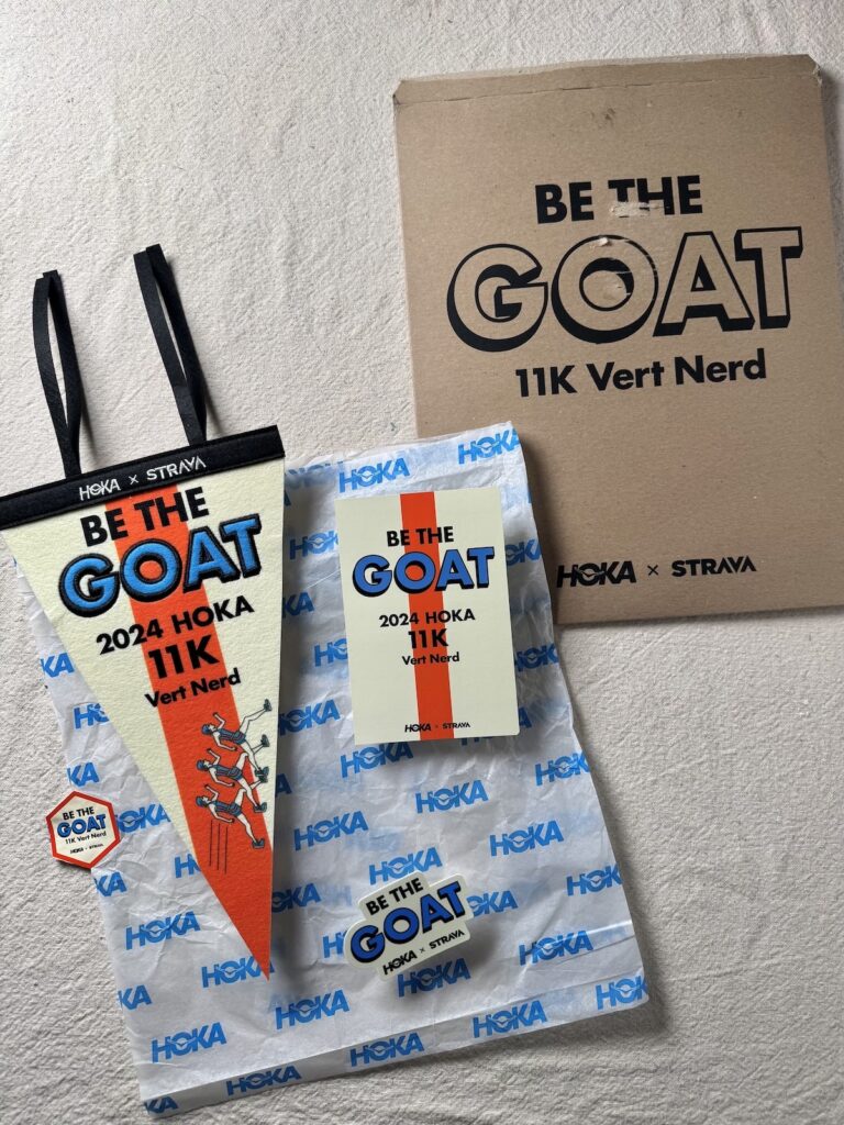 The branded mailer, flag, stickers and postcard were all nicely done: nice printing and the “GOAT” and “Hoka x Strava” text were embroidered. With nearly 64,000 participants and over 8,000 finishers they must’ve sent out a lot of mailers! Not sure why they didn’t reference the challenge’s raison d’être, the Speedgoat 6 launch, on the flag or stickers.